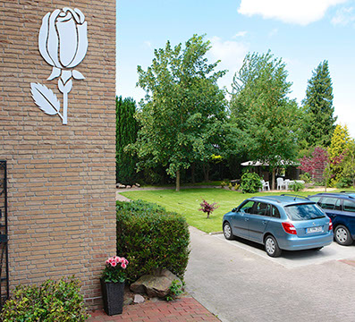 Blick auf Parkplätze und Garten