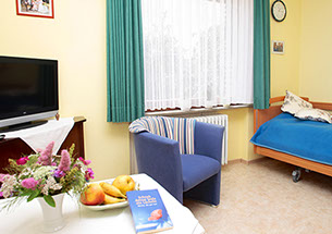 verfügen über lichtspendende große Fenster, sowie Anschlüsse für Fernseher, Telefon und Internet. Selbstverständlich können Sie auch vertraute Gegenstände mitbringen. WC und Bad sind in den Einzelzimmern vorhanden.