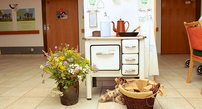 Jeder einzelne Raum wurde mit viel Sorgfalt gestaltet und auf die Bedürfnisse unserer Bewohner abgestimmt. Mit der Möblierung, die sich an den Vorlieben und Gewohnheiten älterer Menschen orientiert, möchten wir entsprechend unserem Leitbild erreichen, dass sich jeder Bewohner und jede Bewohnerin bei uns zu Hause fühlt – „hier wohnt und in einer großen Familie lebt“. Krankenhaus- oder Hotelcharakter durch Kühle, Formstrenge und Sterilität erteilen wir bewusst eine Absage. So trägt z.B. unser Pflegepersonal keine weiße sondern freundlich farbige Kleidung. Die Bewohner können auf Wunsch die Bewohnerzimmer ganz individuell durch mitgebrachte Einrichtungsgegenstände (Schrank, Sessel, Bilder, Wanduhren und sonstige persönliche Dinge) nach ihrem Geschmack gestalten.