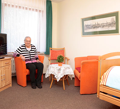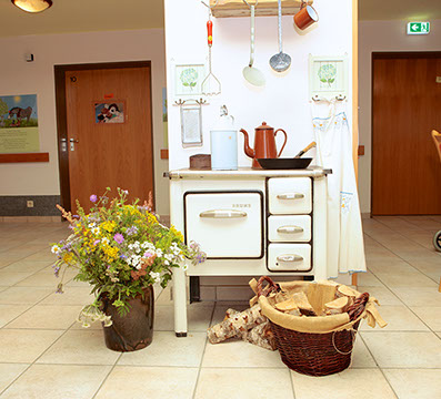 Jeder einzelne Raum wurde mit viel Sorgfalt gestaltet und auf die Bedürfnisse unserer Bewohner abgestimmt. Mit der Möblierung, die sich an den Vorlieben und Gewohnheiten älterer Menschen orientiert, möchten wir entsprechend unserem Leitbild erreichen, dass sich jeder Bewohner und jede Bewohnerin bei uns zu Hause fühlt – „hier wohnt und in einer großen Familie lebt“. Krankenhaus- oder Hotelcharakter durch Kühle, Formstrenge und Sterilität erteilen wir bewusst eine Absage. So trägt z.B. unser Pflegepersonal keine weiße sondern freundlich farbige Kleidung. Die Bewohner können auf Wunsch die Bewohnerzimmer ganz individuell durch mitgebrachte Einrichtungsgegenstände (Schrank, Sessel, Bilder, Wanduhren und sonstige persönliche Dinge) nach ihrem Geschmack gestalten.